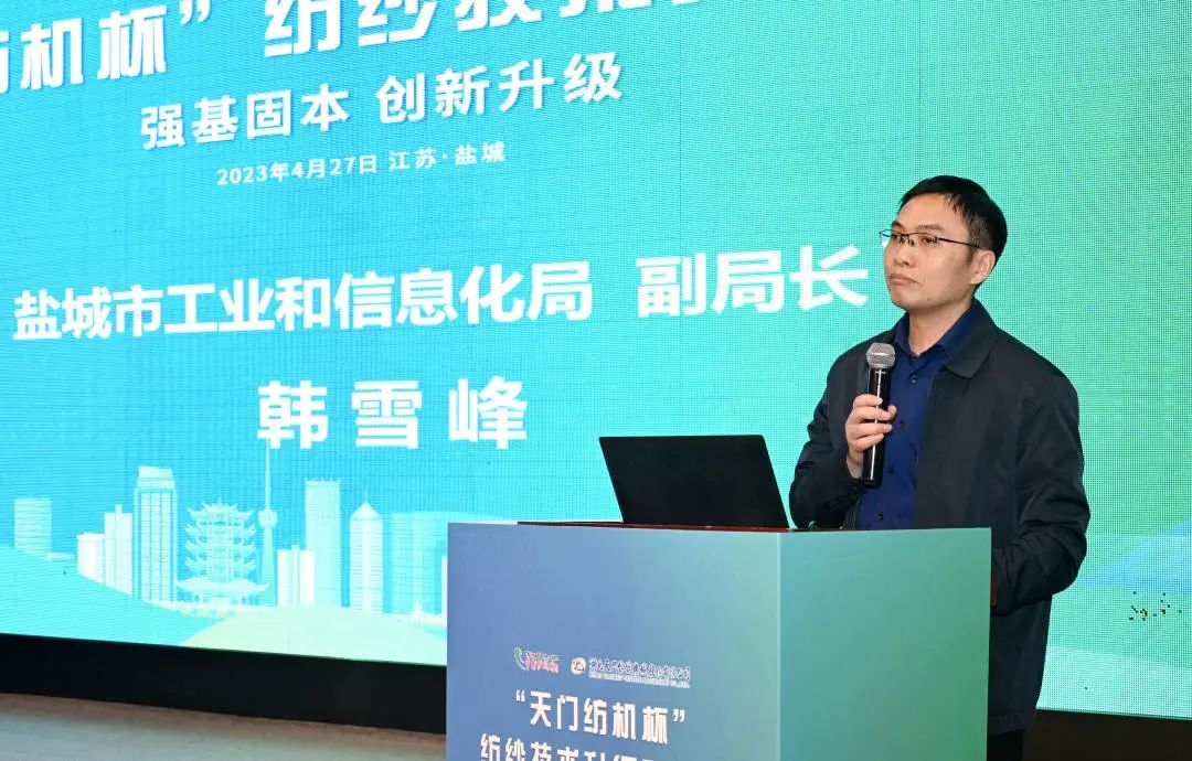 當(dāng)天下午,舉行了開幕式及主題報(bào)告演講,鹽城市工業(yè)和信息化局副局長韓雪峰、鹽城市紡織工業(yè)協(xié)會(huì)會(huì)長戴俊等領(lǐng)導(dǎo)出席會(huì)議并分別致辭,他們對“天門紡機(jī)杯”的舉辦表示歡迎,希望通過本次活動(dòng),加強(qiáng)多地紡織企業(yè)的交流與探討,使鹽城更好地了解市場需求和技術(shù)趨勢,探索鹽城紡織技術(shù)的創(chuàng)新與升級(jí)之路。