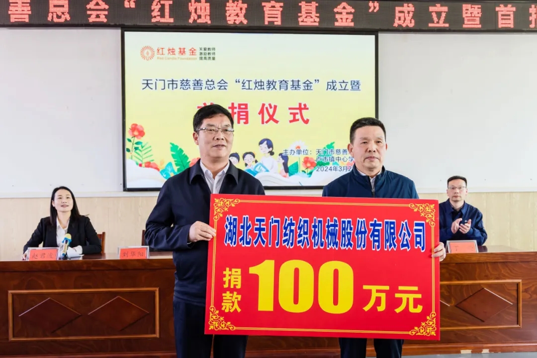 2024年3月21日,天門紡機(jī)董事長(zhǎng)沈方勇出席在天門市盧市鎮(zhèn)盧家口中學(xué)舉行的天門慈善總會(huì)“紅燭教育基金”成立暨首捐儀式,同天門市慈善總會(huì)、教育局三方簽訂了《天門市慈善總會(huì)“紅燭教育基金”協(xié)議書(shū)》,并現(xiàn)場(chǎng)捐贈(zèng)100萬(wàn)元,用于獎(jiǎng)勵(lì)盧市鎮(zhèn)優(yōu)秀教師和幫扶困難教師等公益活動(dòng),助力盧市鎮(zhèn)教育高質(zhì)量發(fā)展。天門市人民政府副市長(zhǎng)古玉麗,天門市民政局局長(zhǎng)、市慈善總會(huì)會(huì)長(zhǎng)謝金才,天門市教育局局長(zhǎng)劉華陽(yáng),天門市慈善總會(huì)秘書(shū)長(zhǎng)李貴清,盧市鎮(zhèn)宣傳統(tǒng)戰(zhàn)委員劉恒超以及盧市鎮(zhèn)部分教師代表等參加首捐儀式。盧市鎮(zhèn)黨委書(shū)記趙君波主持儀式。