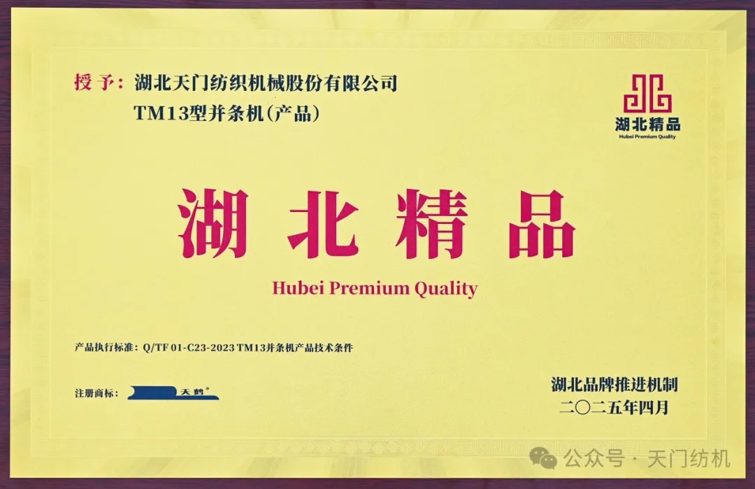 為貫徹落實《湖北省質(zhì)量強省建設(shè)綱要》《建設(shè)品牌湖北推動高質(zhì)量發(fā)展行動綱要》有關(guān)部署,湖北省品牌推進機制辦公室從2023年起,正式啟動了“湖北精品”培育認定工作。其中,第二屆動員了562家經(jīng)營主體,有643個(項)產(chǎn)品成功入庫培育,最終161 個(項)產(chǎn)品入列“湖北精品”。天門紡機TM13型并條機脫穎而出,傲立榜單。
